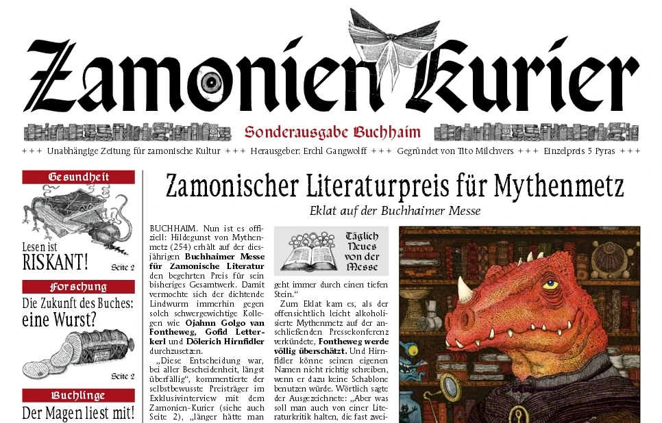 Enthalten sind Bilder, Texte und Informationen rund um das neue Buchhaim. Kurz vor Erscheinen des Kuriers erhielt Hildegunst von Mythenmetz den Zamonischen Literaturpreis für sein damaliges Gesamtwerk und antwortete mit der für ihn in dieser Phase seines Lebens typischen Arroganz und Selbstgefälligkeit darauf in einem Interview, dass er den Preis vielleicht ablehne, obwohl er ihn bereits angenommen hatte.